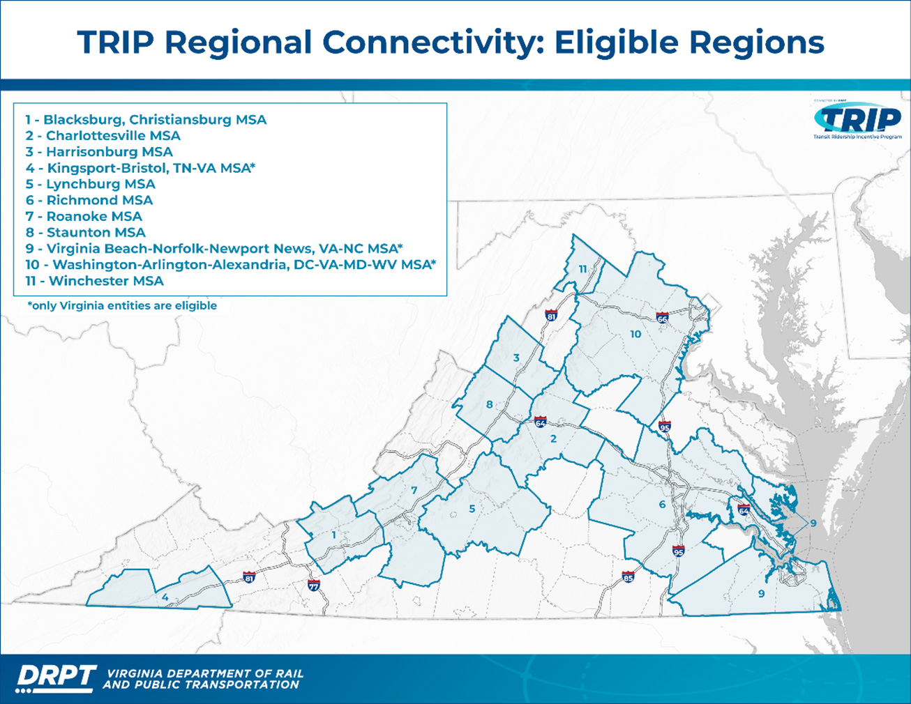 Le DRPT gère le Transit Ridership Incentive Program (TRIP), qui fournit des fonds aux agences de transport en commun et aux organes directeurs dans le but de créer des réseaux de transport en commun plus accessibles, plus sûrs et plus importants sur le plan régional. Le programme TRIP finance quatre catégories de projets : tarif zéro et tarif réduit, connectivité régionale, sécurité publique et équipements et installations pour les passagers.